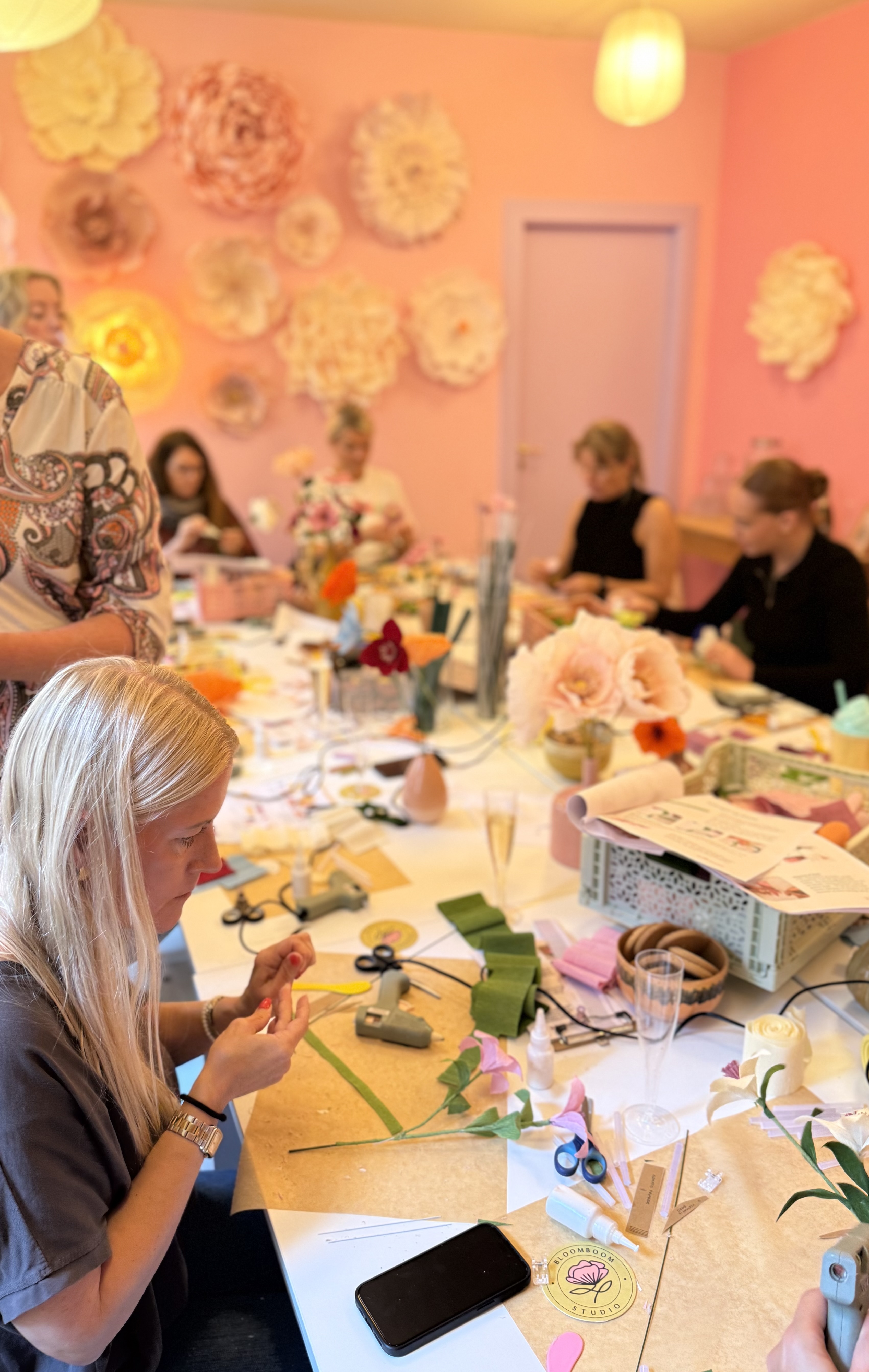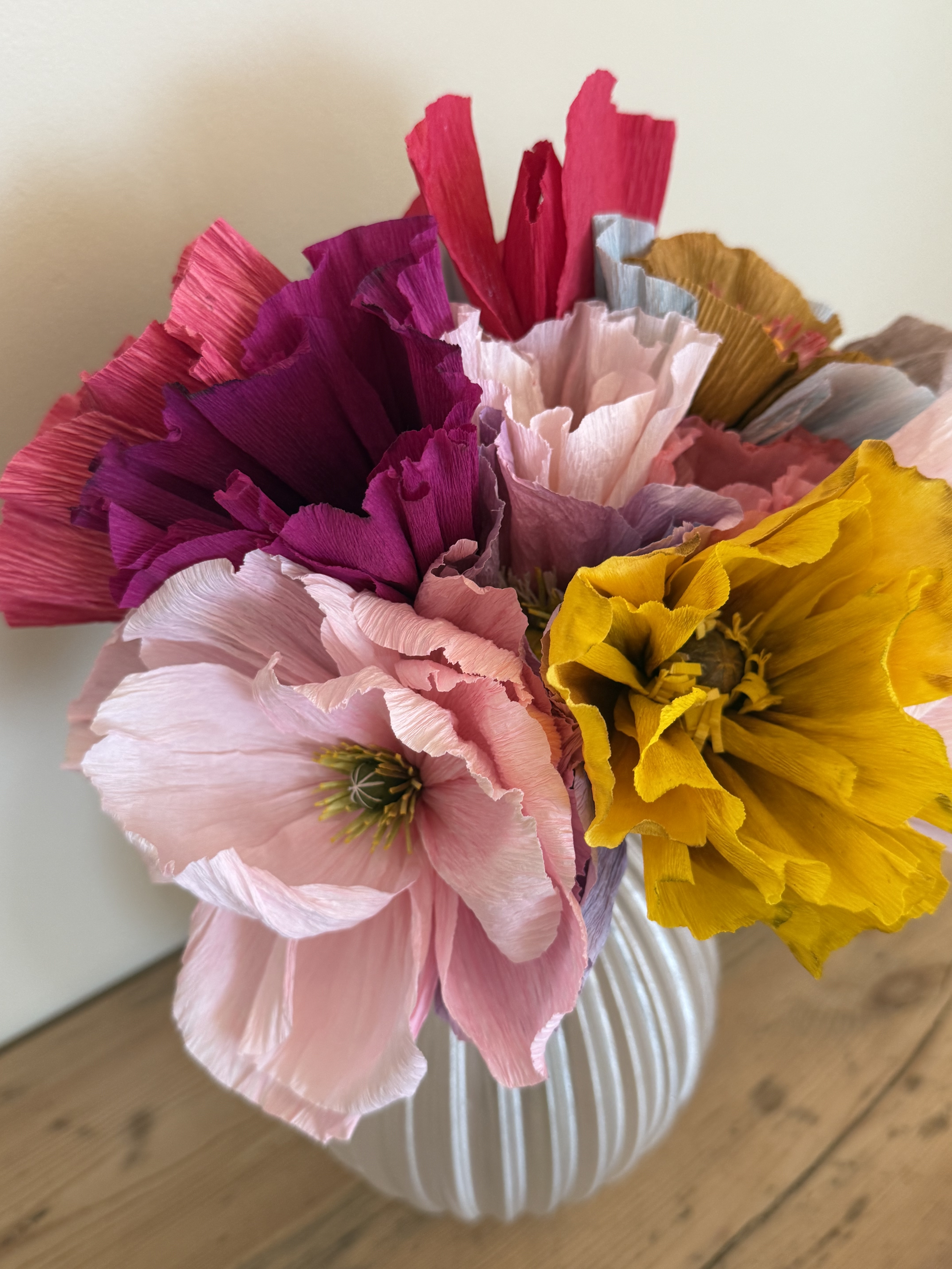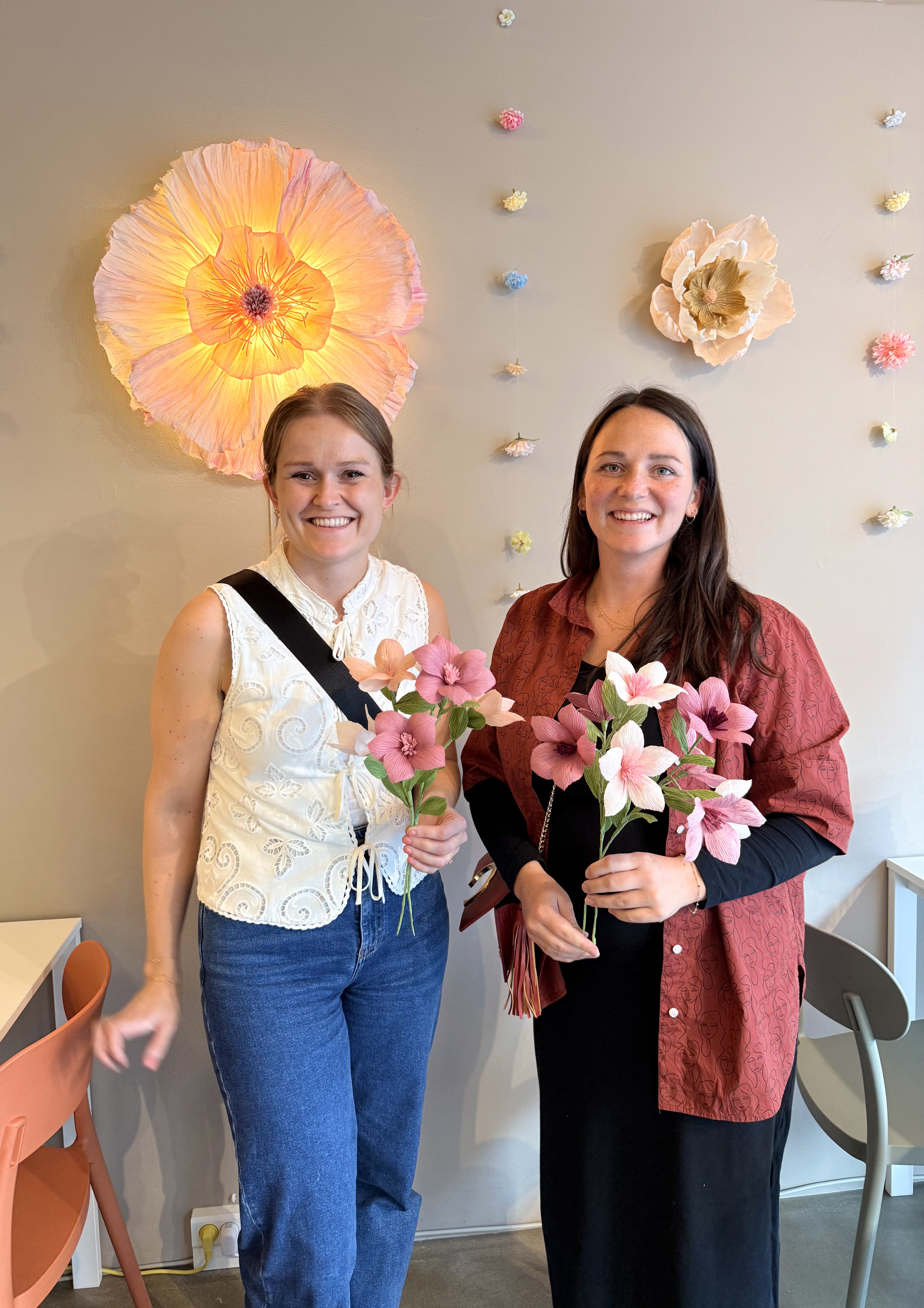 Vi stiller alt til rådighed: italiensk crepepapir i skønne nuancer, lim, værktøj, stilke og skabeloner. Du vælger selv farver og udtryk – og vi hjælper dig godt i gang.