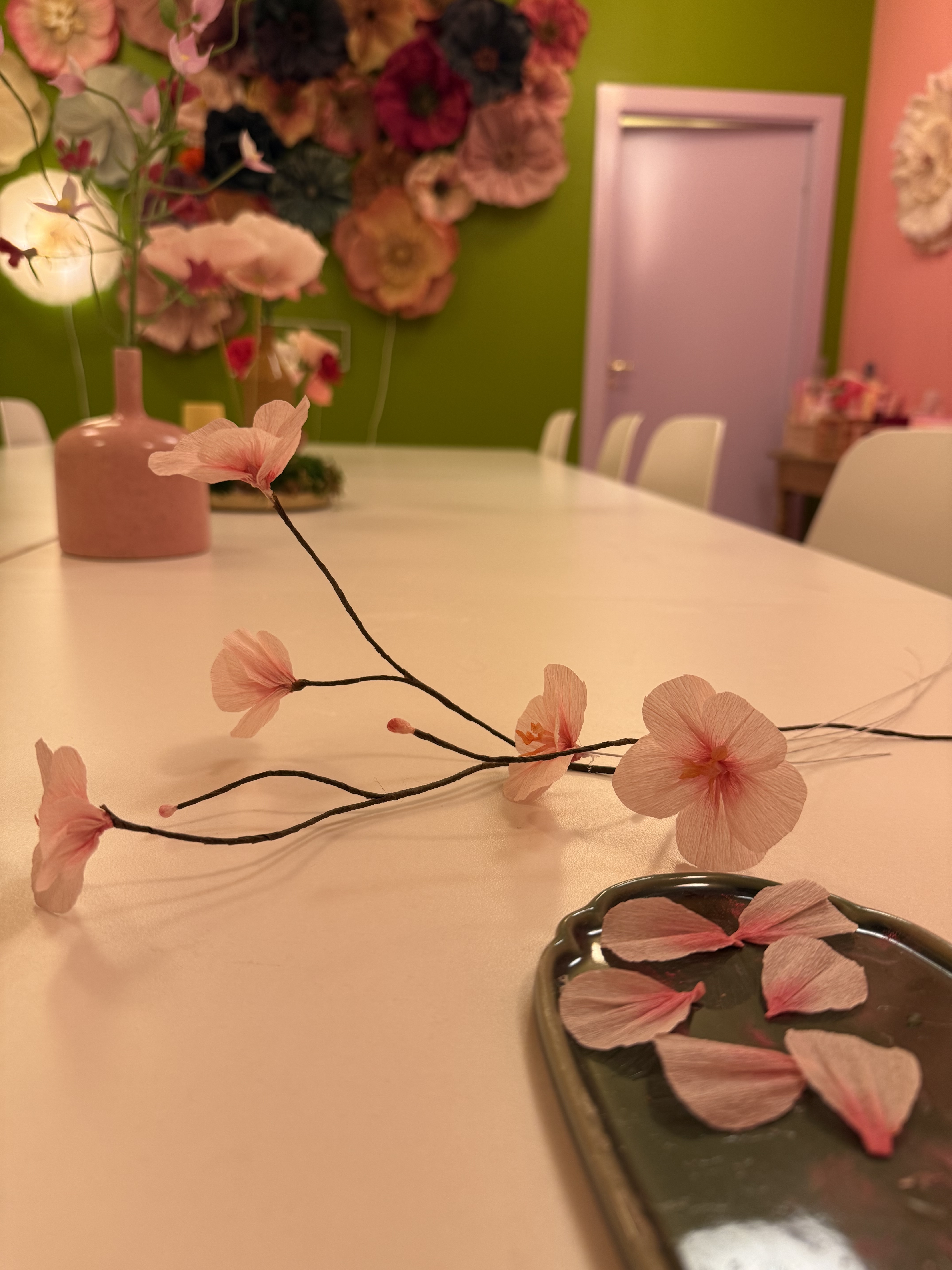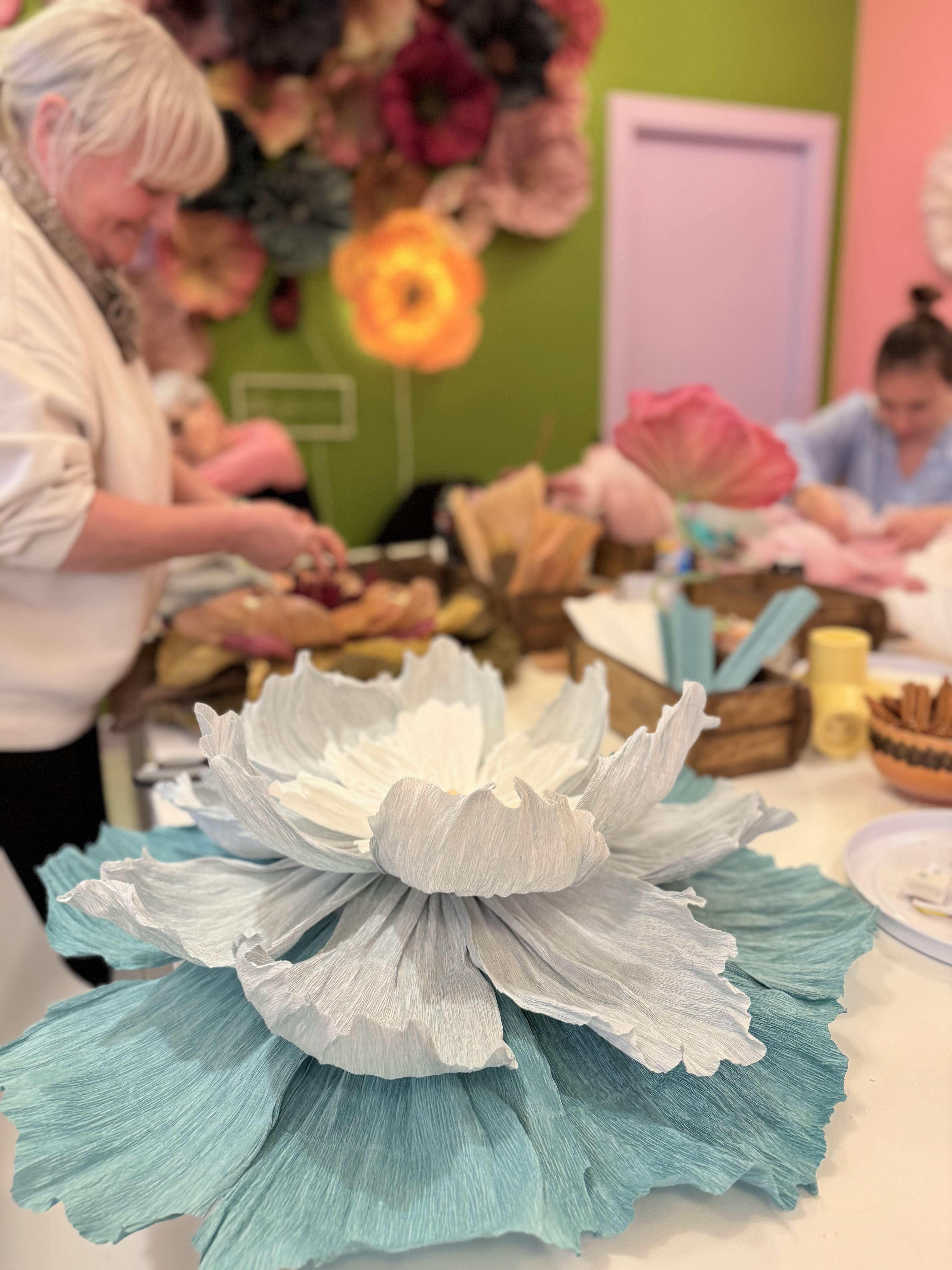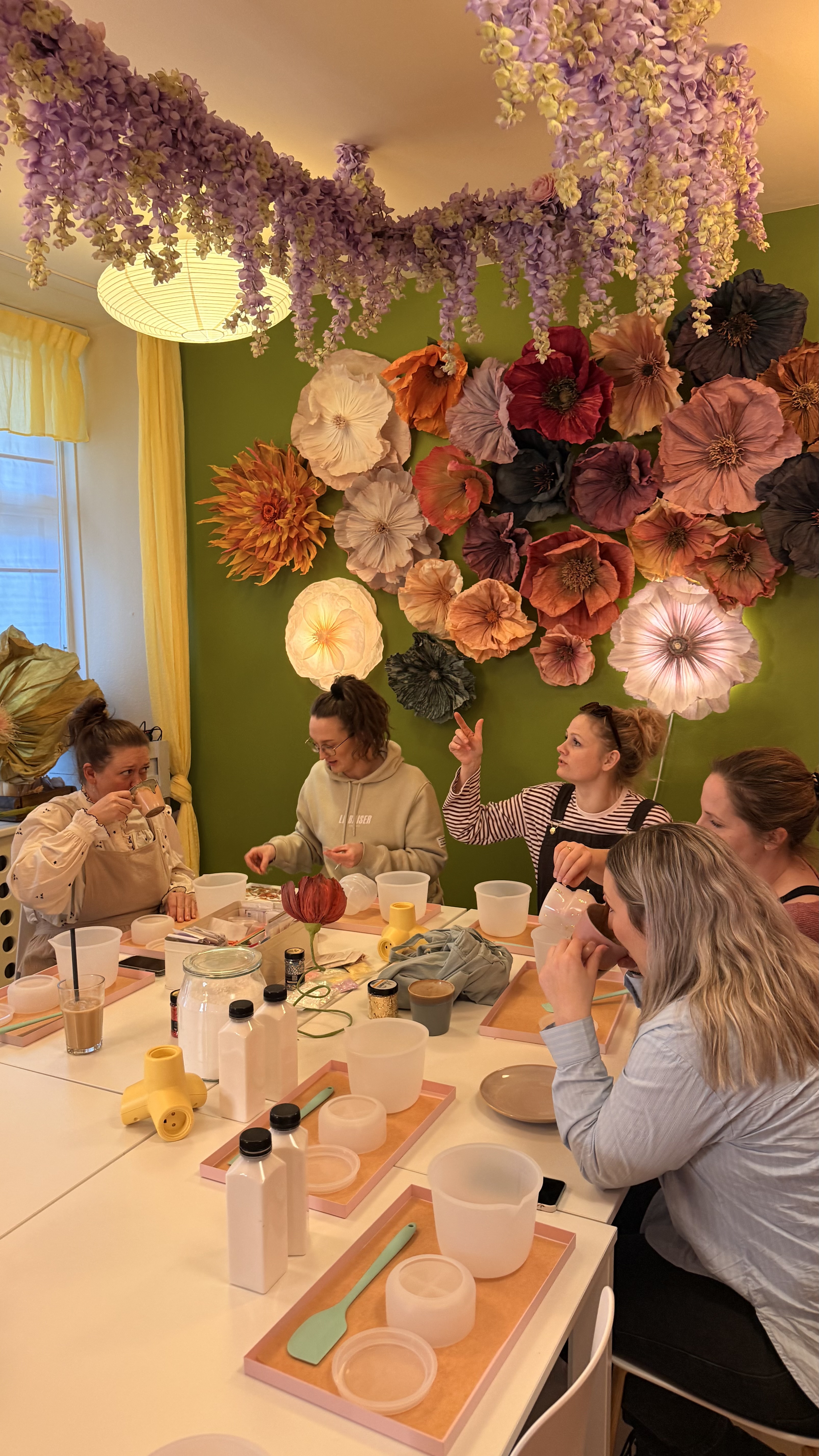 En af vores mest populære aktiviteter til polterabend er papirblomster. Hver deltager laver én blomst til sig selv – og én til bruden. Til sidst samles alle blomsterne i en smuk og farverig buket, som bruden får med hjem som et unikt og varigt minde om dagen og alle dem, der var med til at fejre hende.
